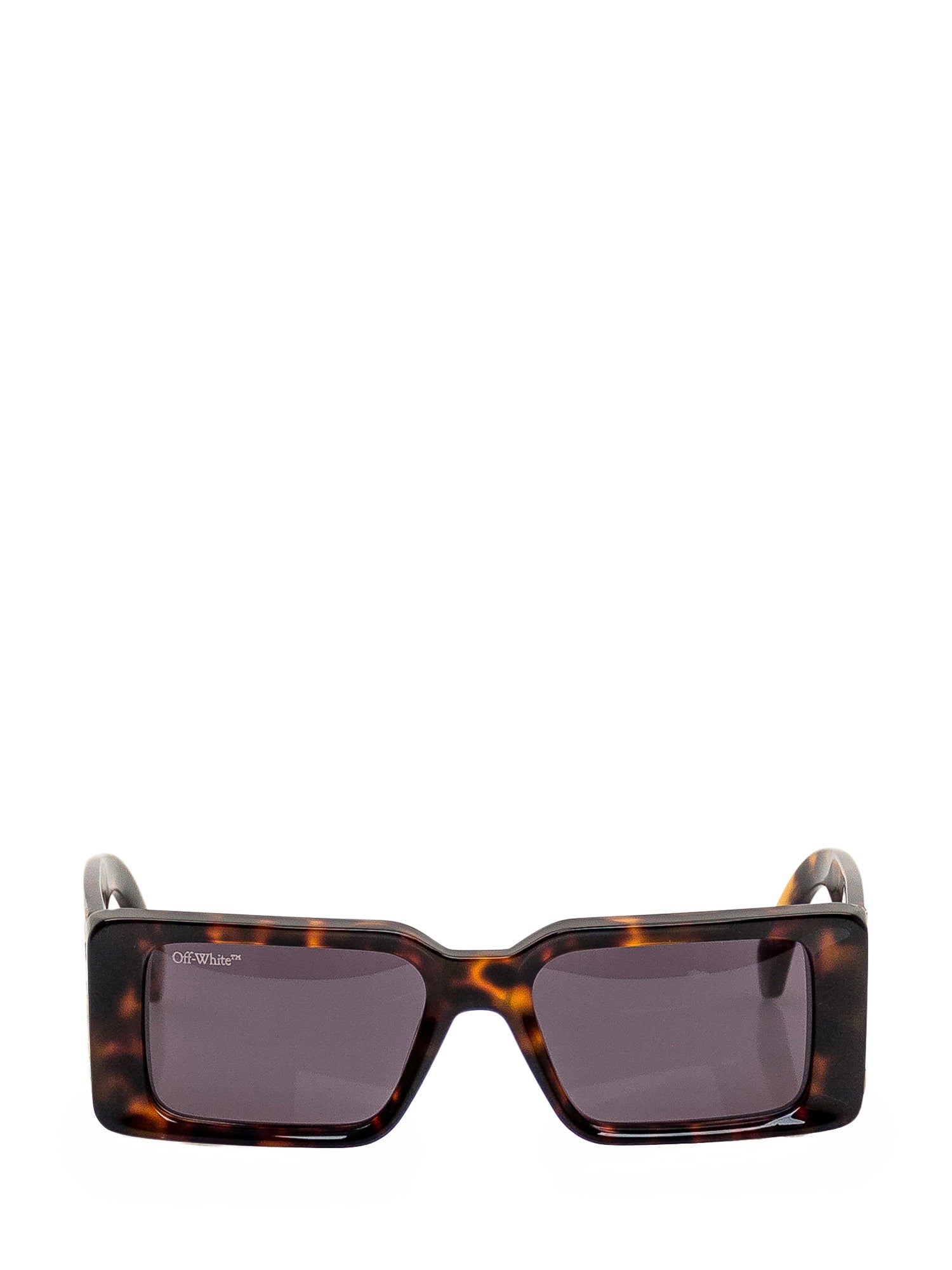 Occhiali da sole maculati. Montatura rettangolare. Lenti scure. Logo sul lato.