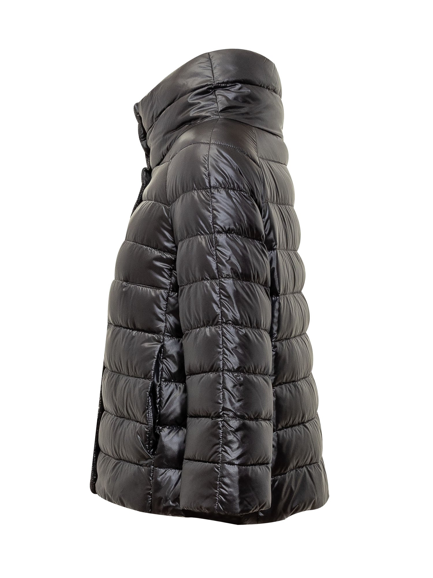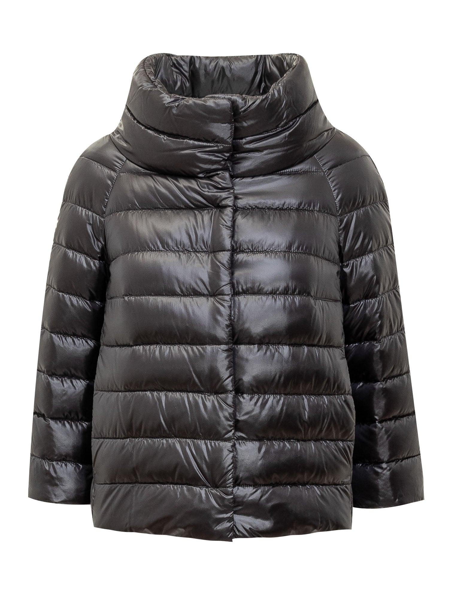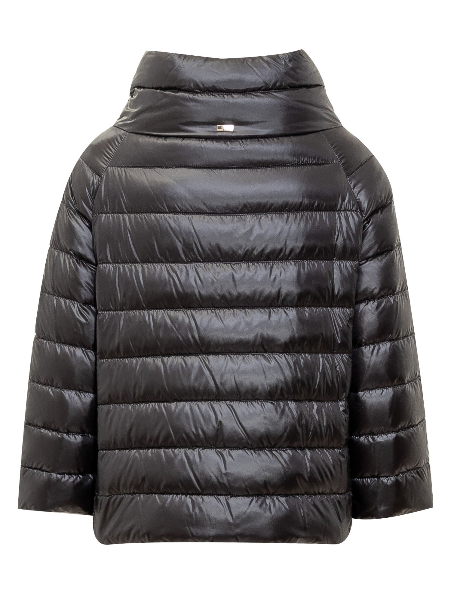 Piumino corto. Collo alto e ampio. Chiusura con bottoni. Due tasche laterali. Logo applicato sul retro.