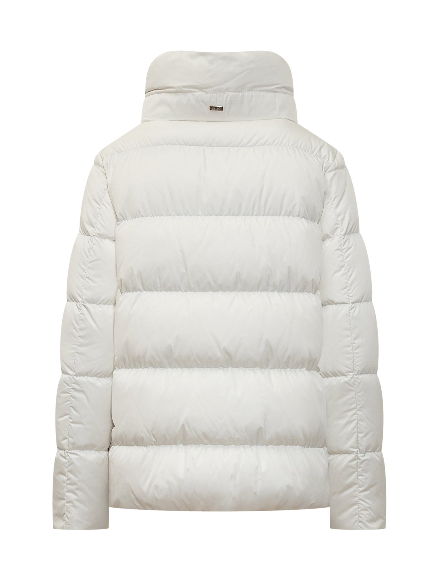 Piumino bianco a collo alto. Coulisse. Tasche laterali. Targhetta logo sul retro. Chiusura con bottoni. Effetto raso.