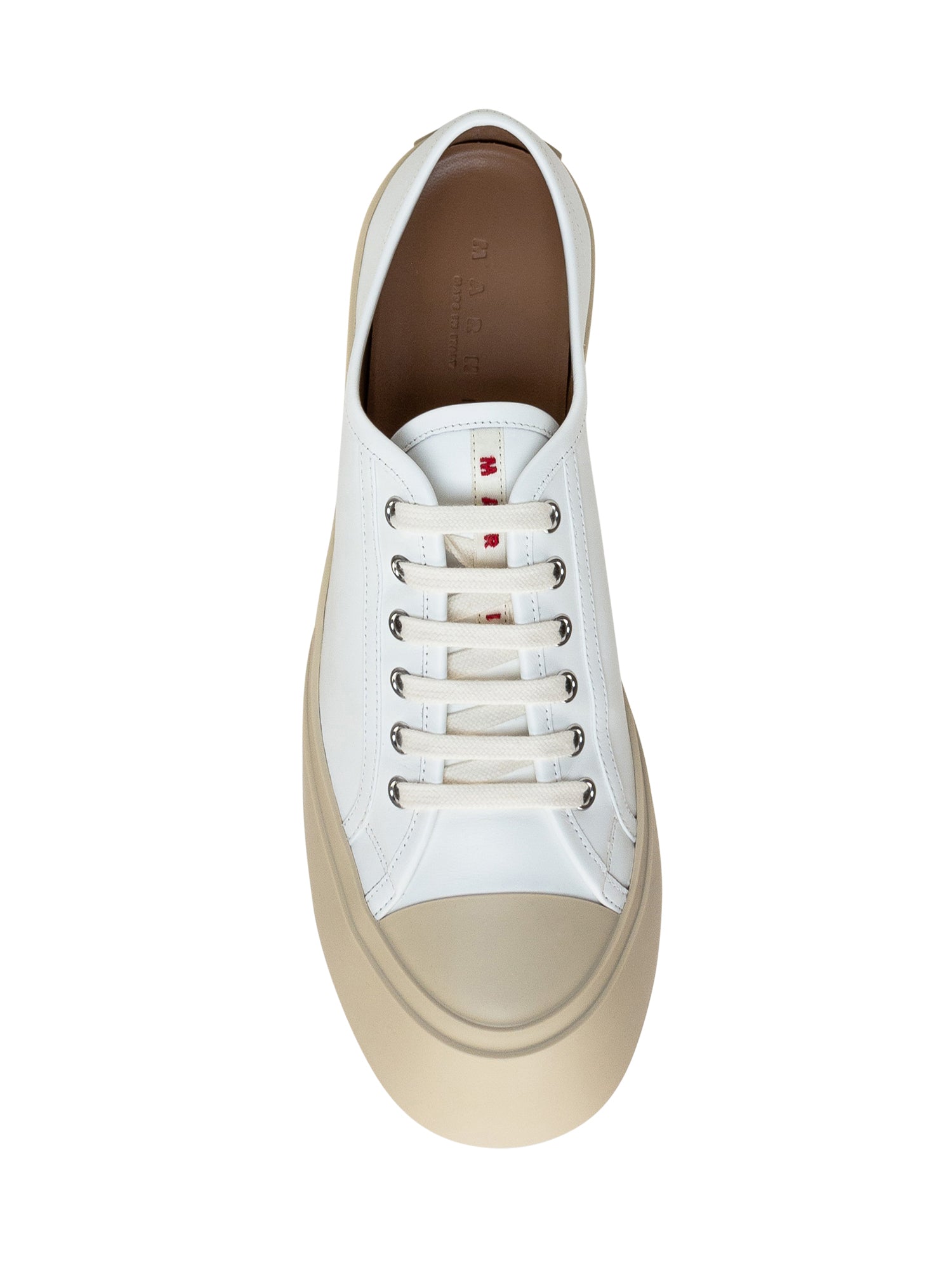 Sneaker bassa bianca di pelle con platform. Chiusura con lacci. Logo su linguetta e tallone.